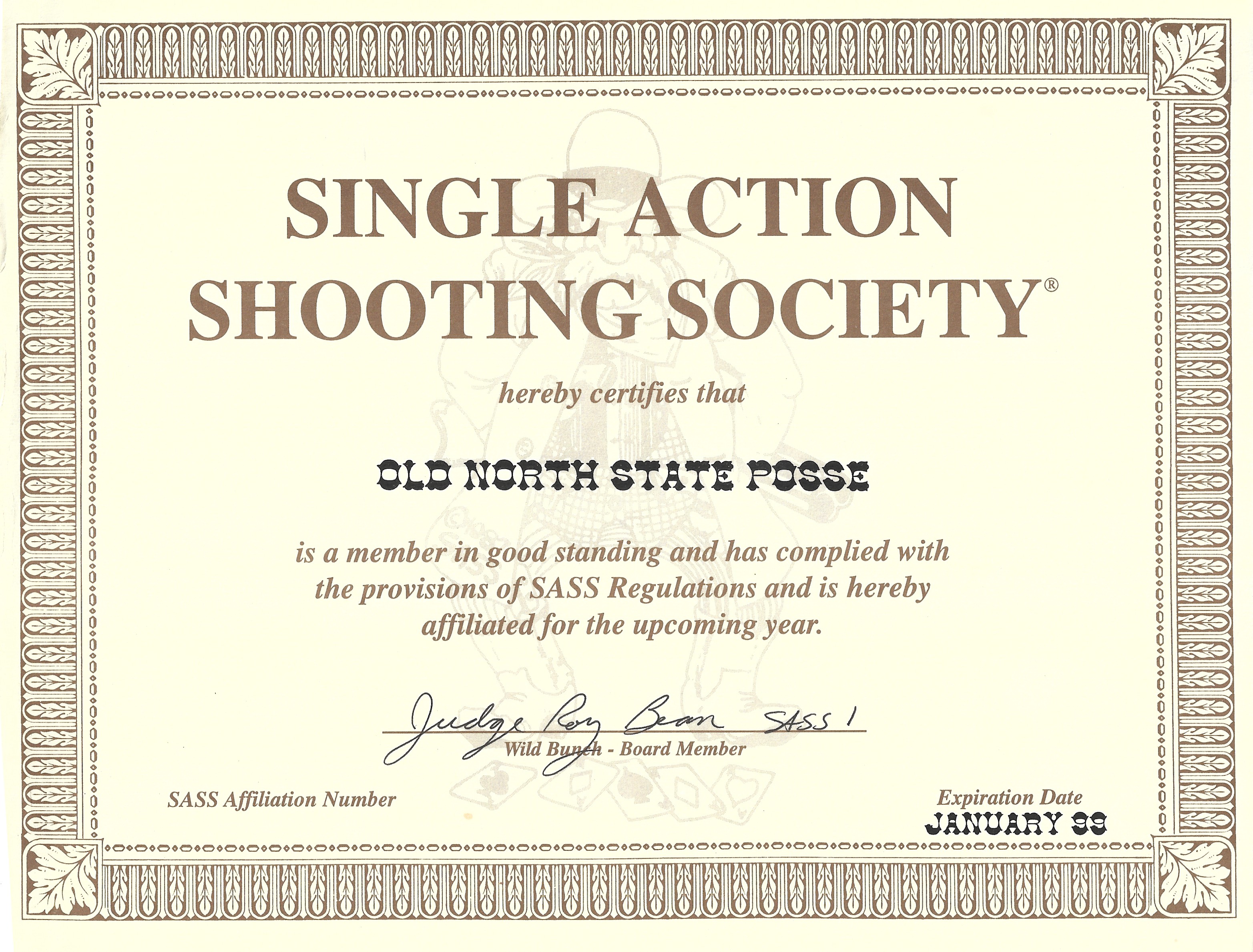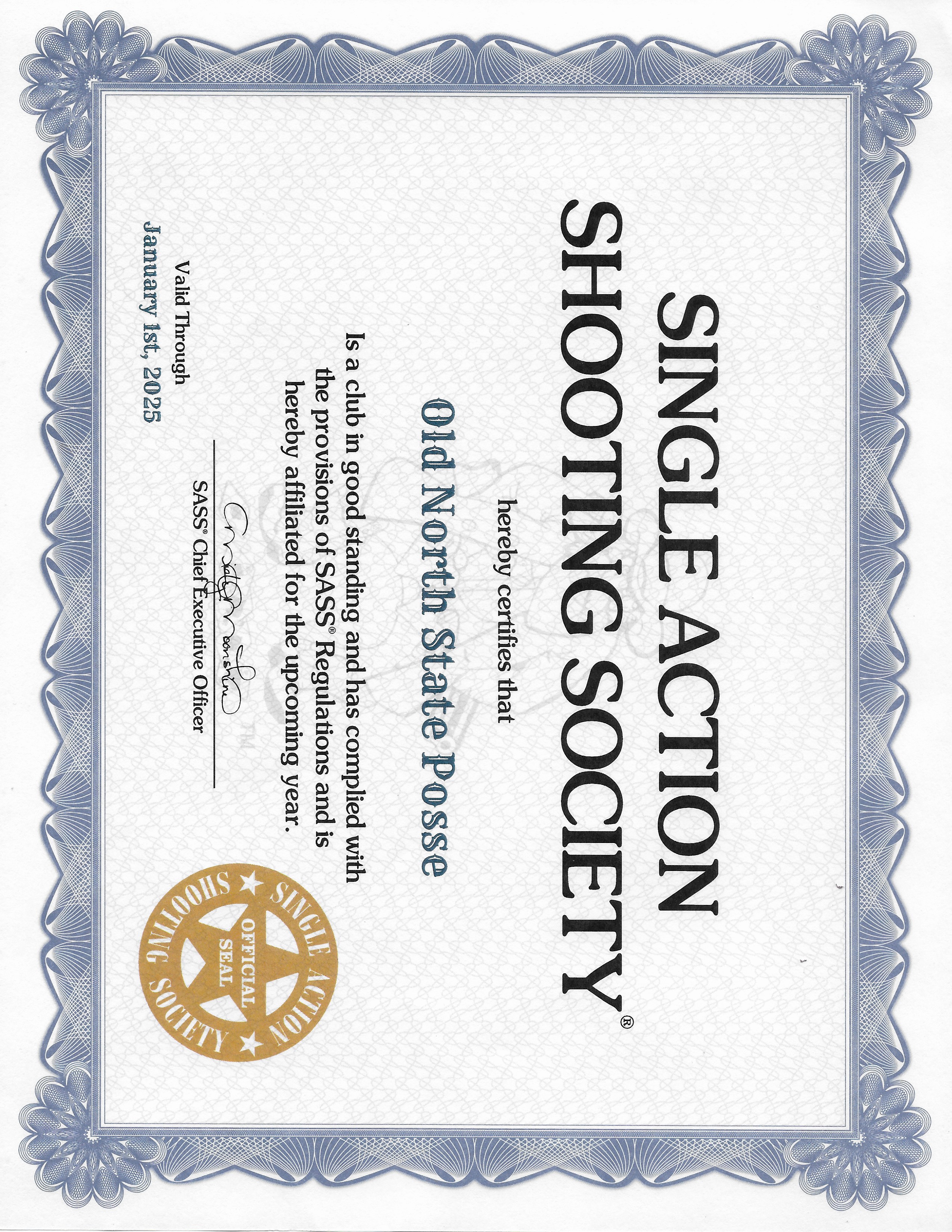 ONSP is a SASS affiliated club that has operated out of the Rowan County Wildlife Association (RCWA) range in Salisbury, NC for 25+ years. The earliest confirmed ONSP SASS affiliation is 1997. Current ONSP SASS Affiliation Certificate Historical ONSP SASS Affiliation Certificate (1999) ONSP annual membership is calendar year based - Jan. thru Dec. of each year. Membership renewals for the new year typically start in Dec. and run into the early months of the new year. The current annual membership fee is $15 for an individual and $25 for a family. The funds raised from the ONSP annual memberships typically covers most of our annual ONSP liability insurance requirements - keeps us operational. Being an ONSP member also gives you a $5 discount on all ONSP monthly matches, automaticaally includes you in the Shoot for Loot program and allows ONSP members to use ONSP poker chip awards for a reduced match fee of $5 and either 7 poker chips of any value or 4 Clean Match chips. With the exception of any ONSP annual/special matches (none currently scheduled), all ONSP monthly matches are 6 stages and the match fees are $15 for ONSP members and $20 for those that are not ONSP members.
